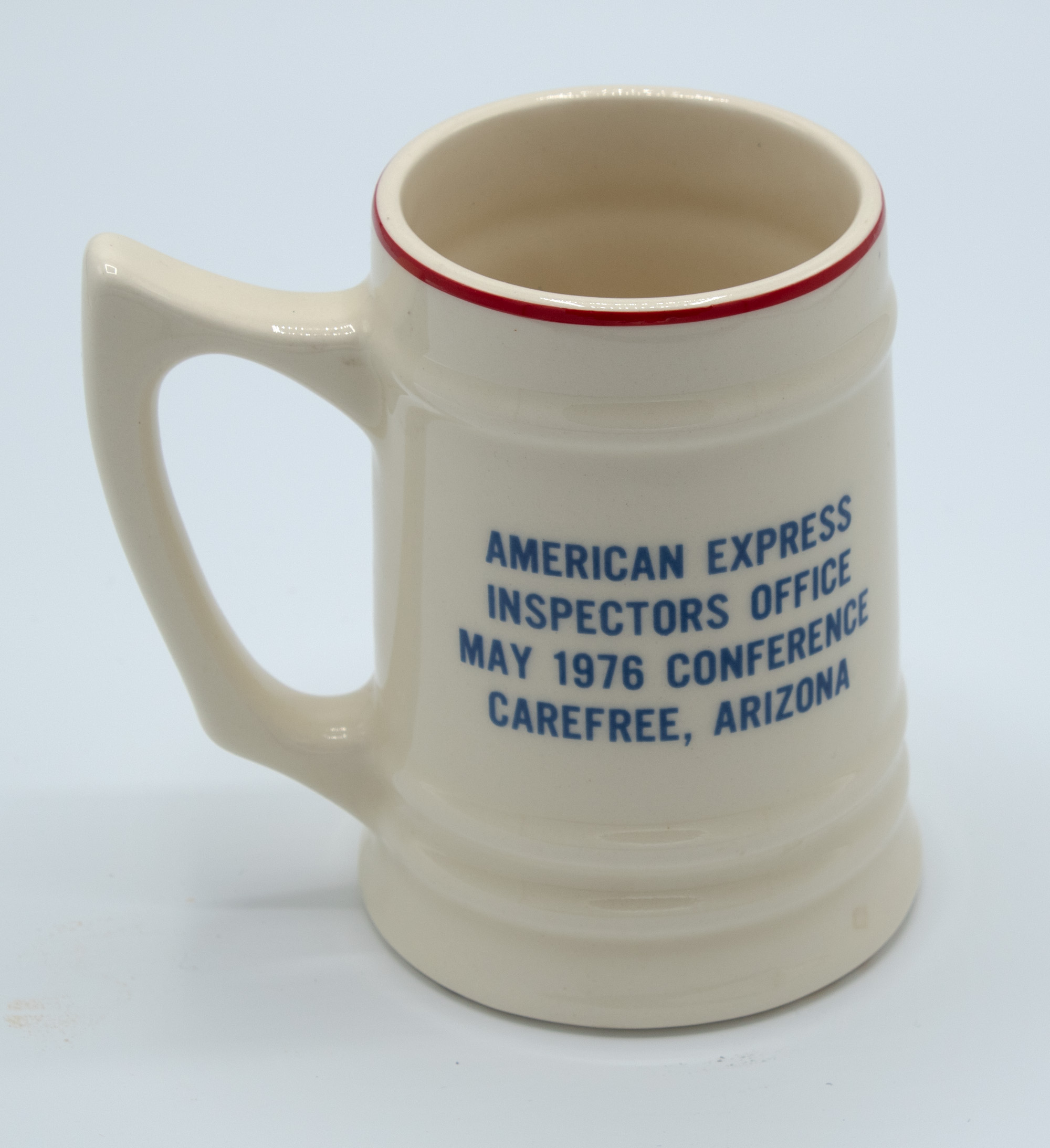 This stoneware stein was a conference take-away for the American Express Inspectors Office. Manufacture mark is Buntingware.