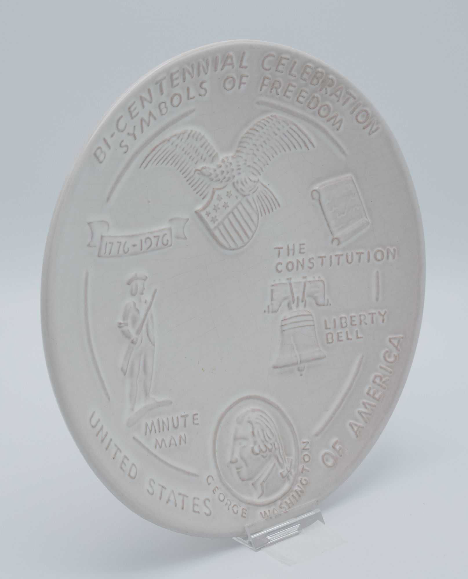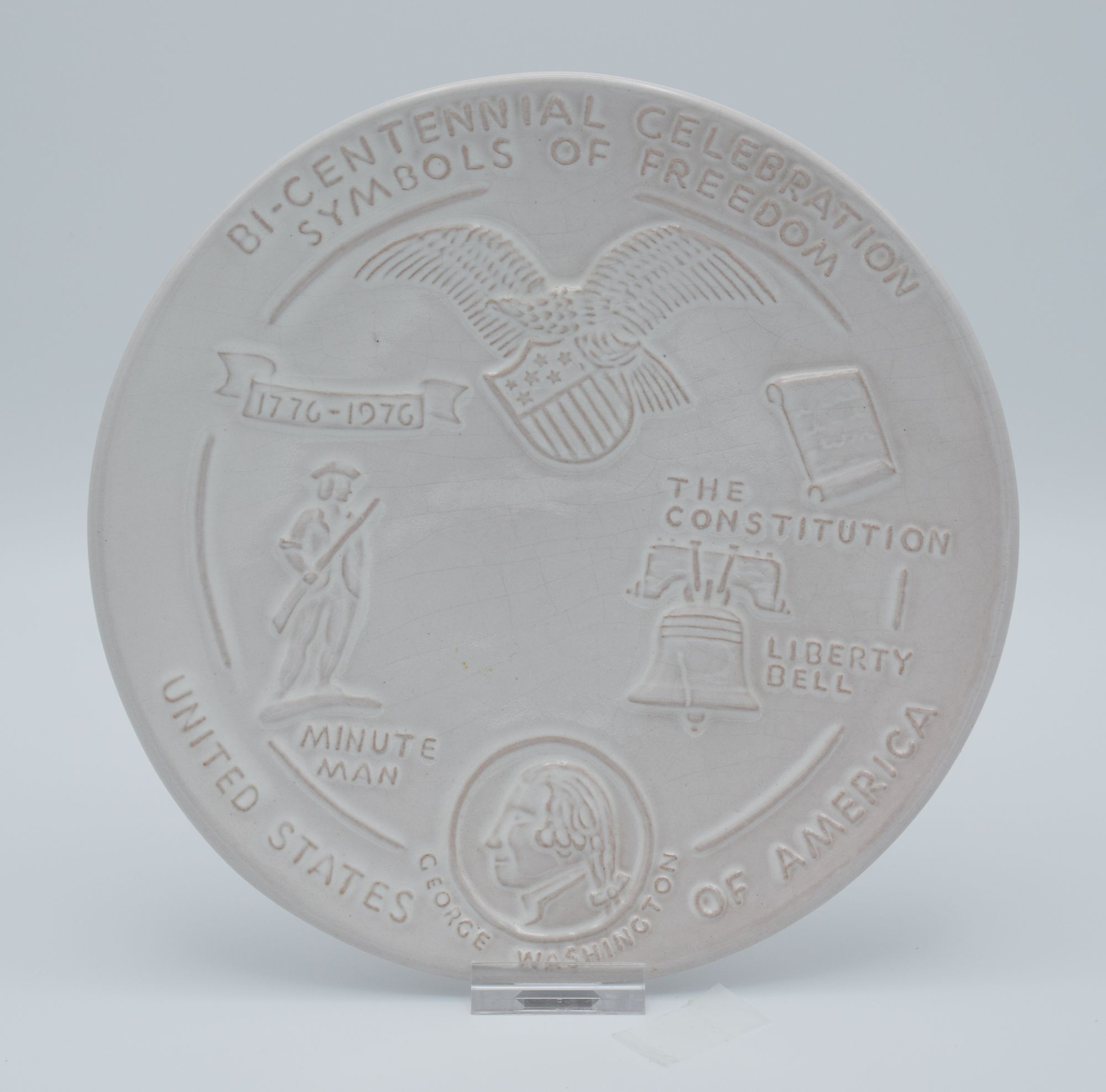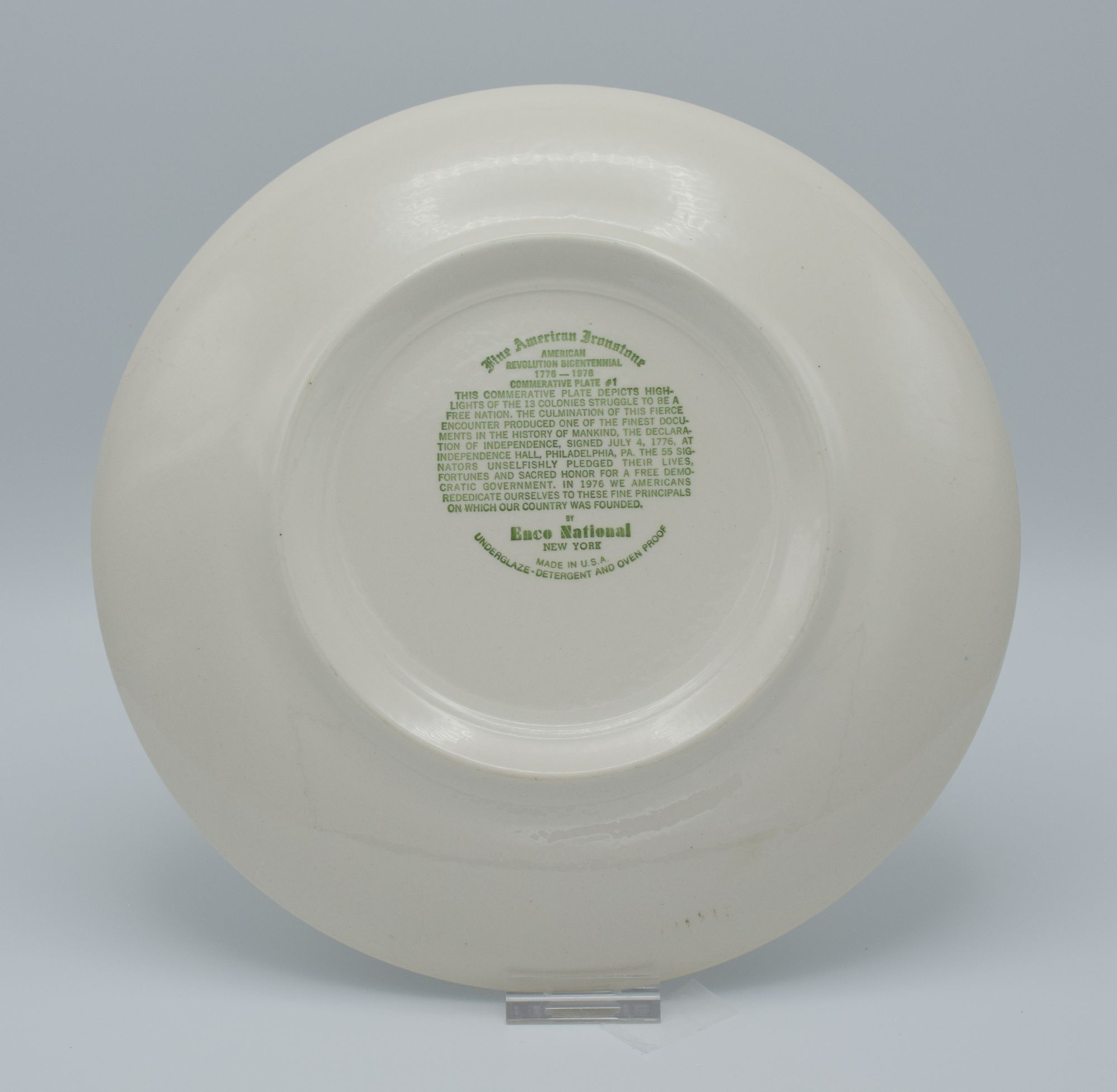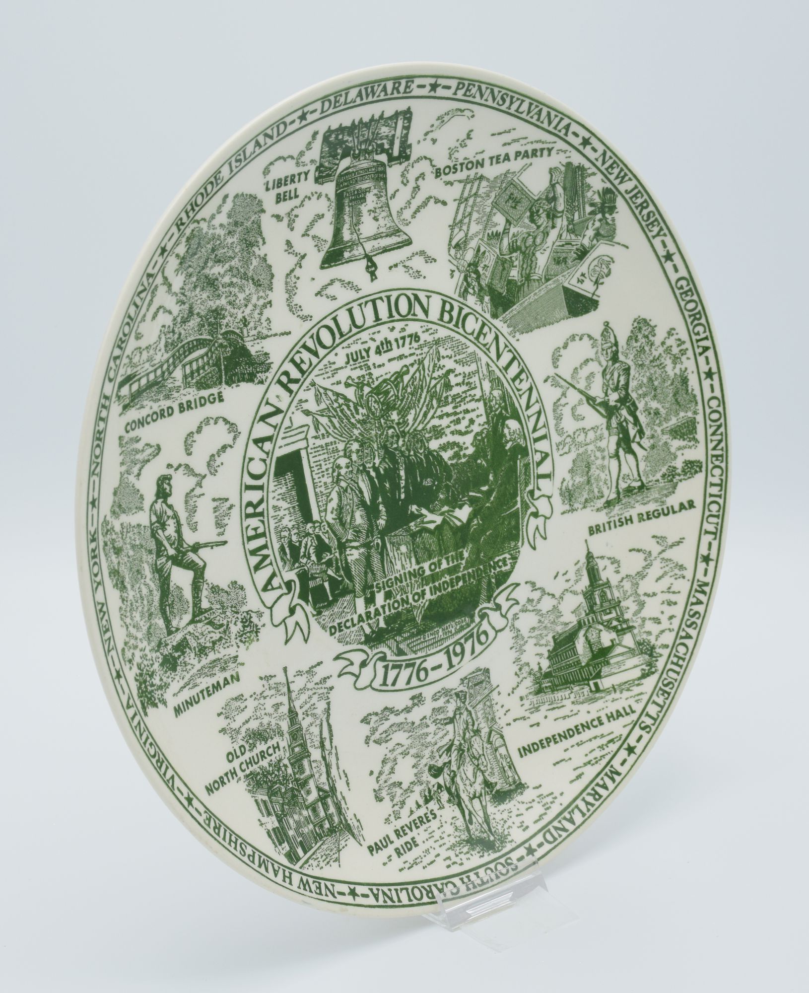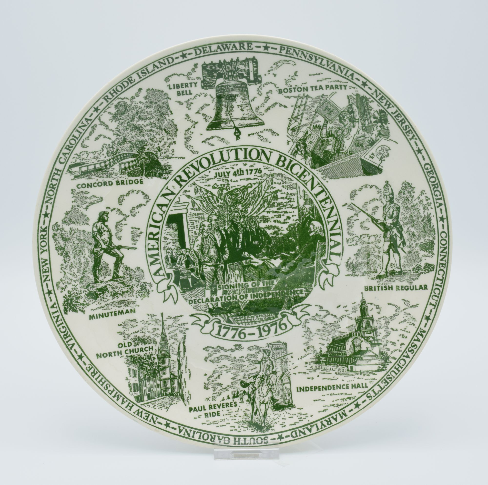 This one green-on-white plate produced by Enco National claims to be the first in a series (of two known versions) and “depicts highlights of the 13 colonies struggle to be a free nation.” What makes this plate (and series) unusual among “collectibles” is that it is marked dishwasher and oven safe! Another version of the same plate was made in brown-on-white.