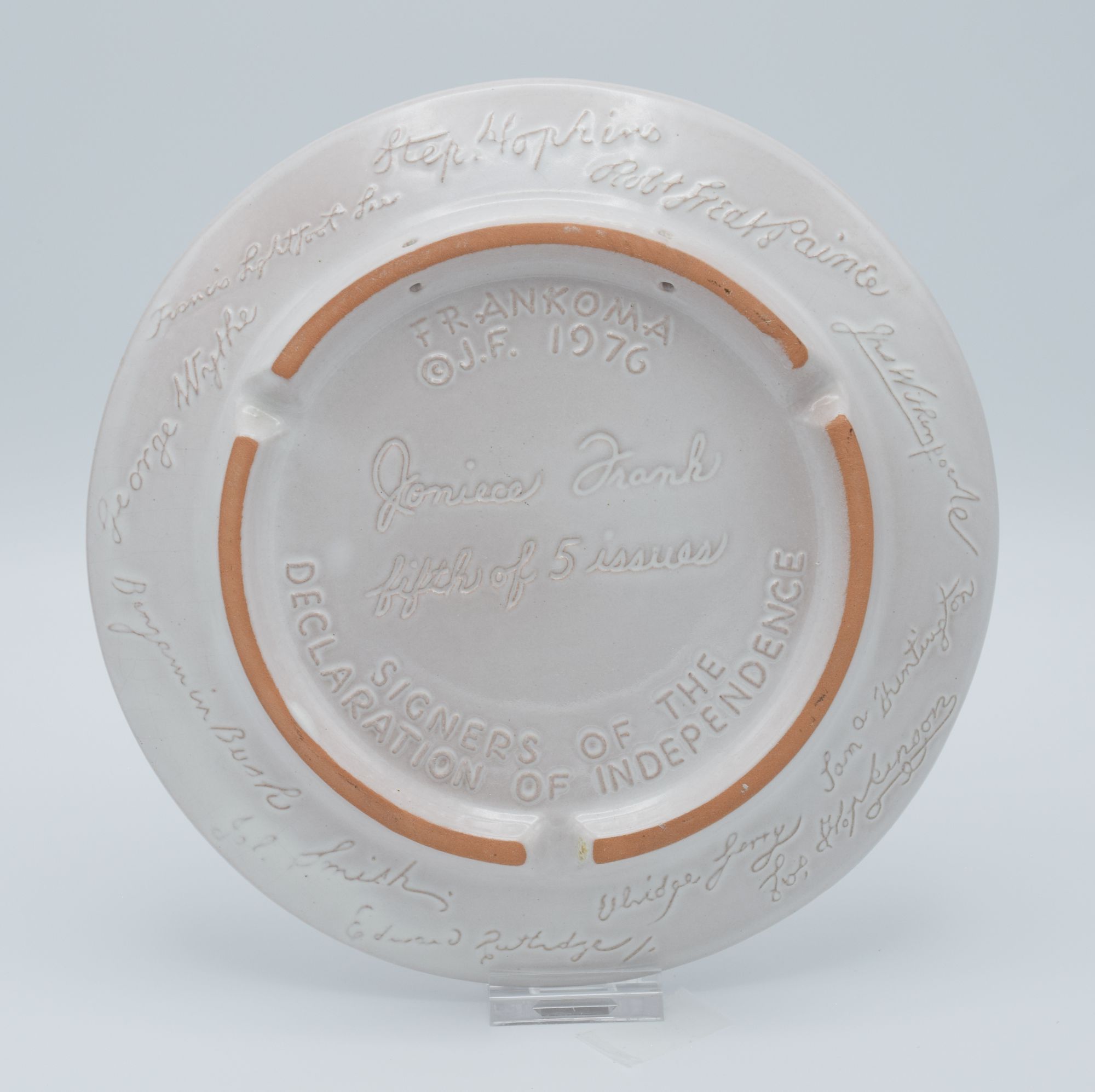 This single plate has a thick white crackle glaze and is marked as number five in a series of five. It features the signature of Joniece Frank, the designer, along with reproductions of 11 of the Declaration of Independence signers. The other plates feature different signatures.
