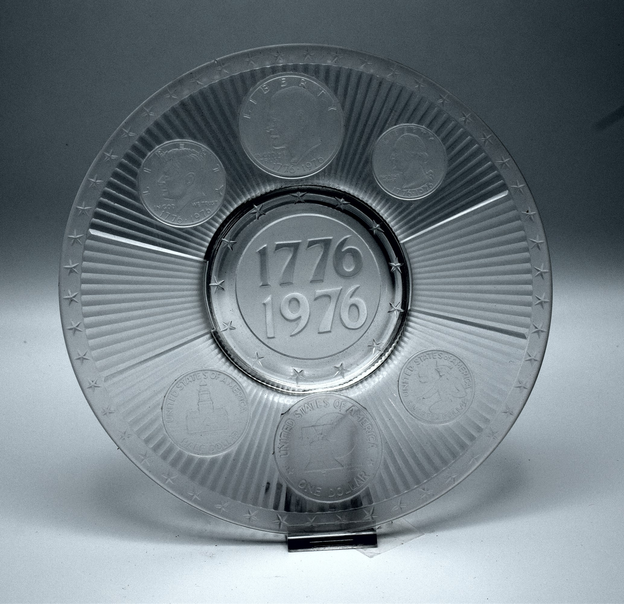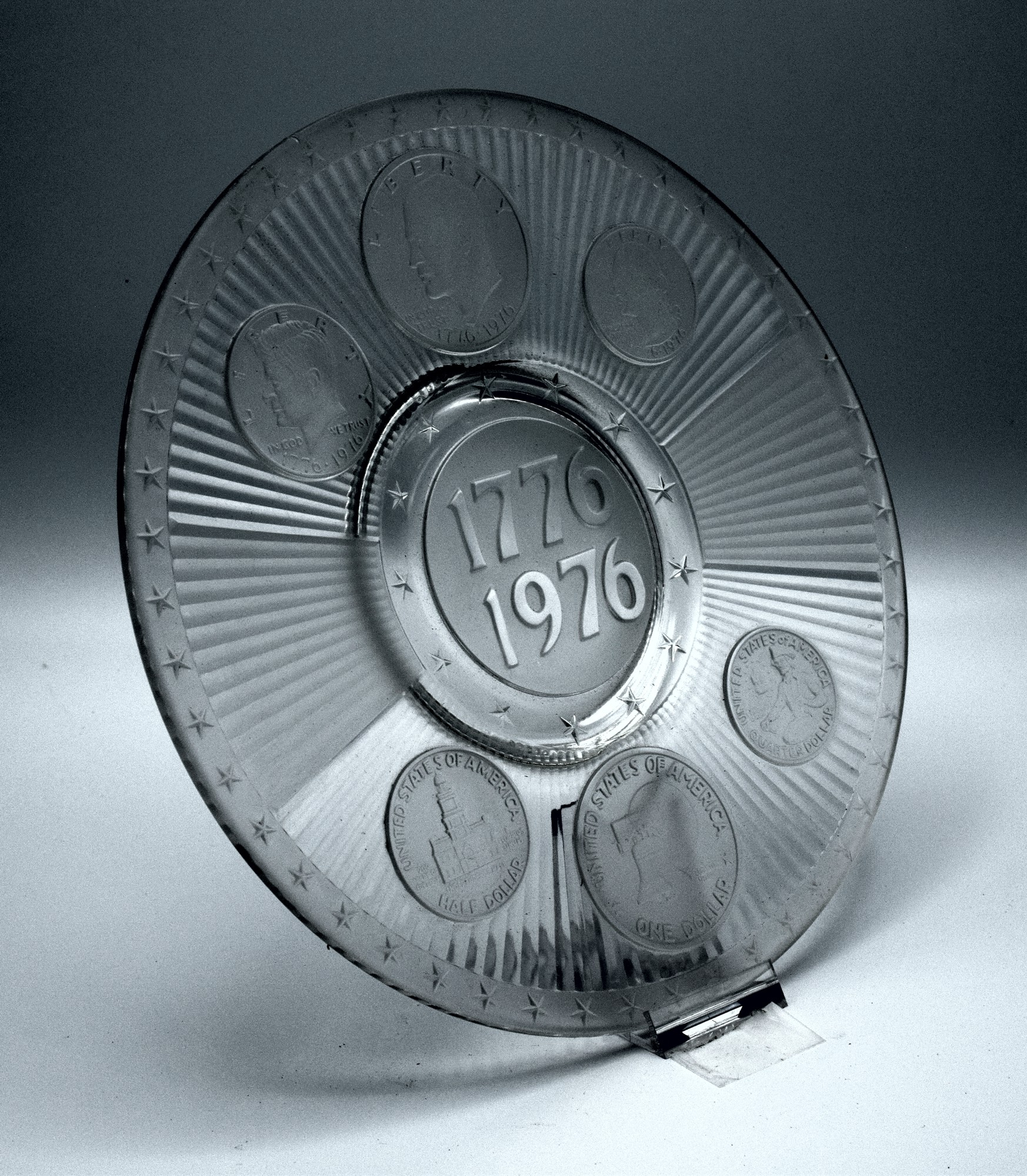 This fine glass plate depicts the special edition coins from 1976: quarter, half-dollar, and dollar. Imperial Glass was a division of Lenox. This plate includes the original retail box and pamphlet detailing the significance of the bars, stars, and coins. The crystal has a satin finish which allows the relief to be seen better.