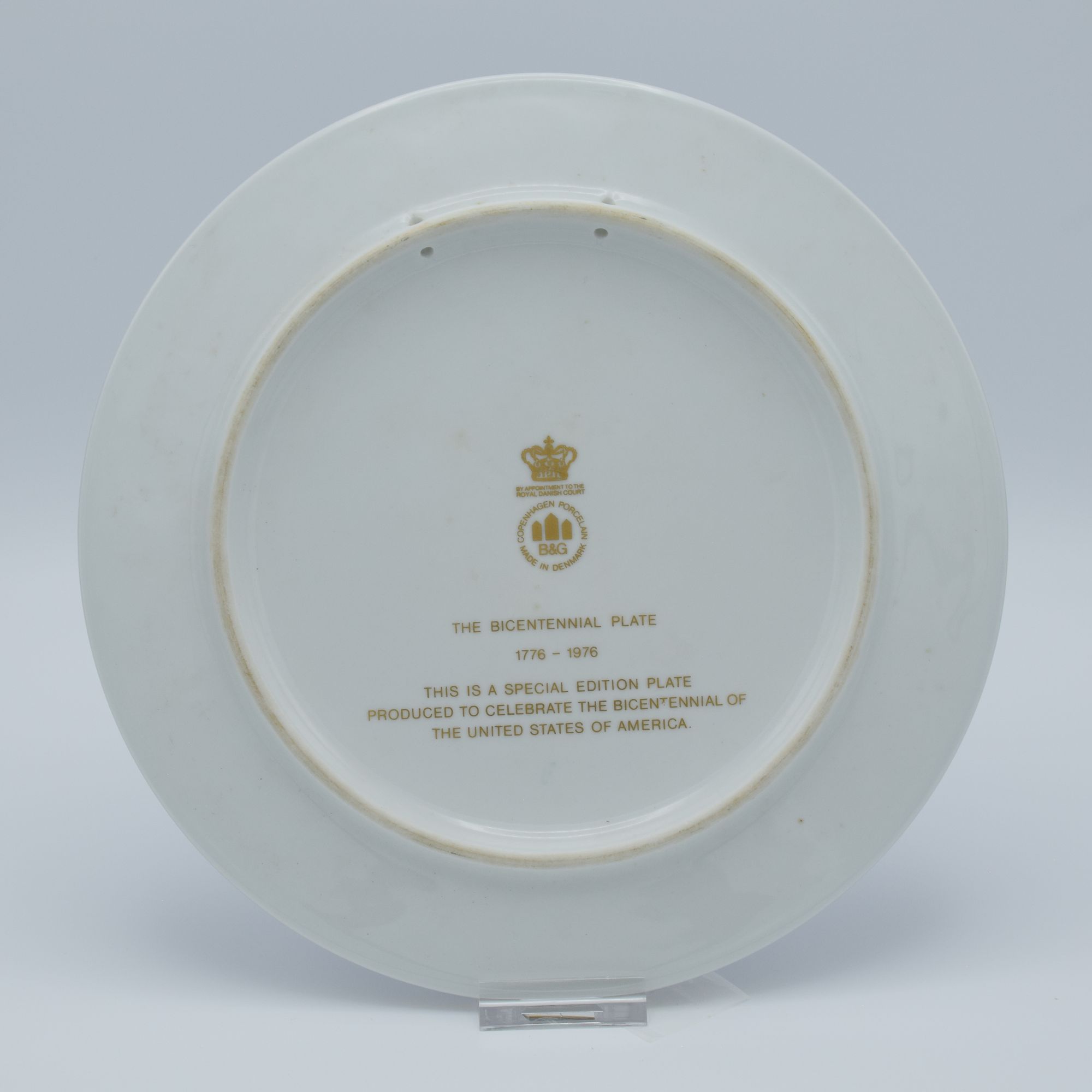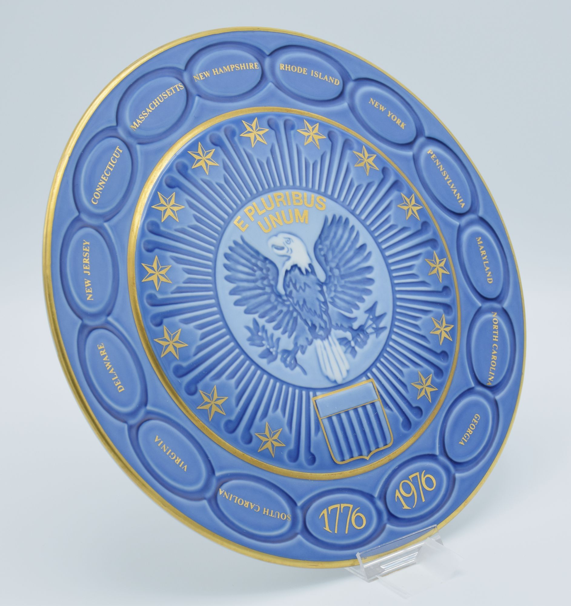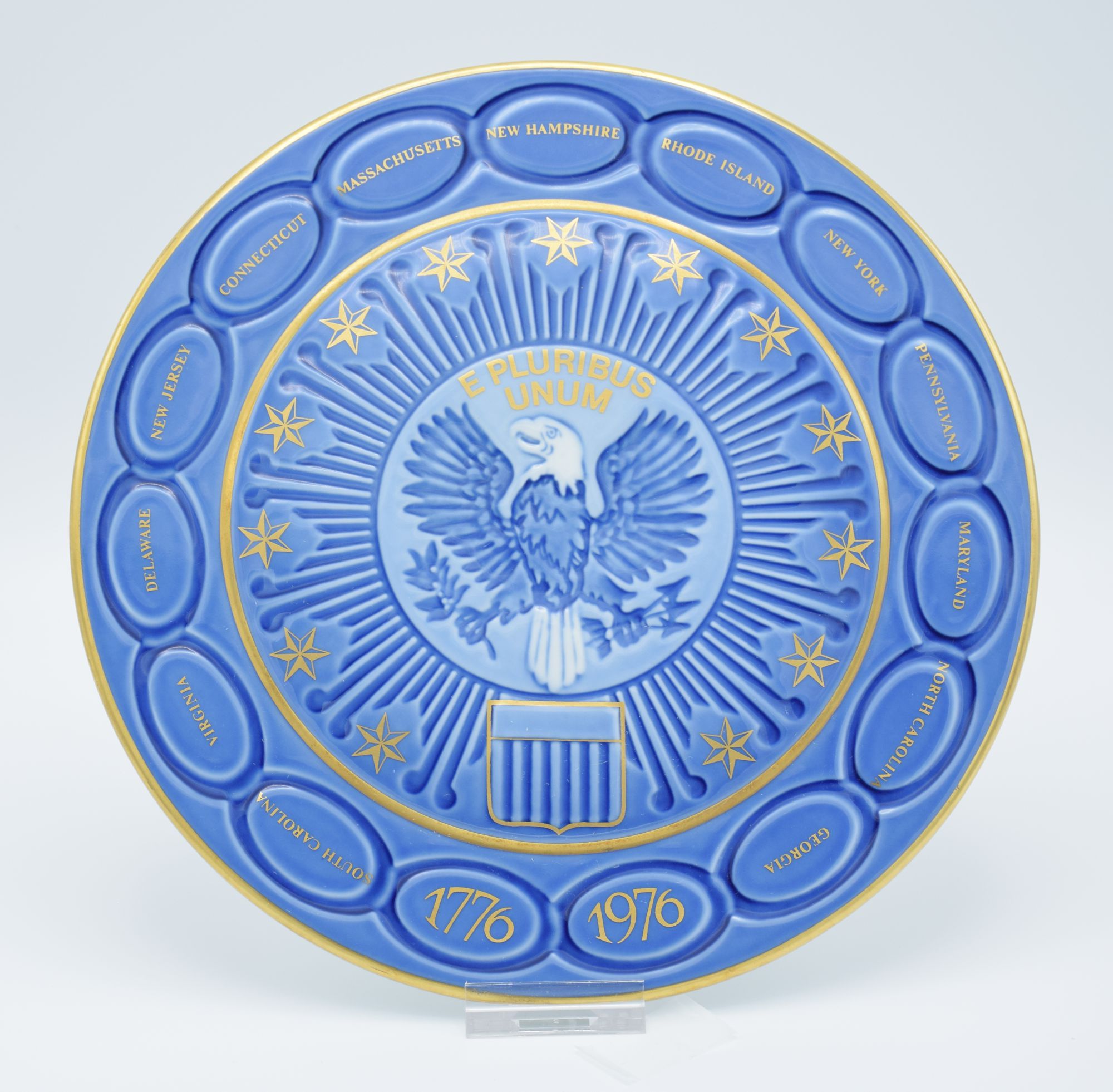 This plate is notable only in that it is flat; it can’t hold food! Other than that, it’s not particularly unique as a search of eBay for “bicentennial plate” reveals a plethora of this model for sale. The pretty blue and gold adornment lists the original 13 colonies. It was produced by B&G Copenhagen Porcelain (now Royal Copenhagen) in Denmark.
